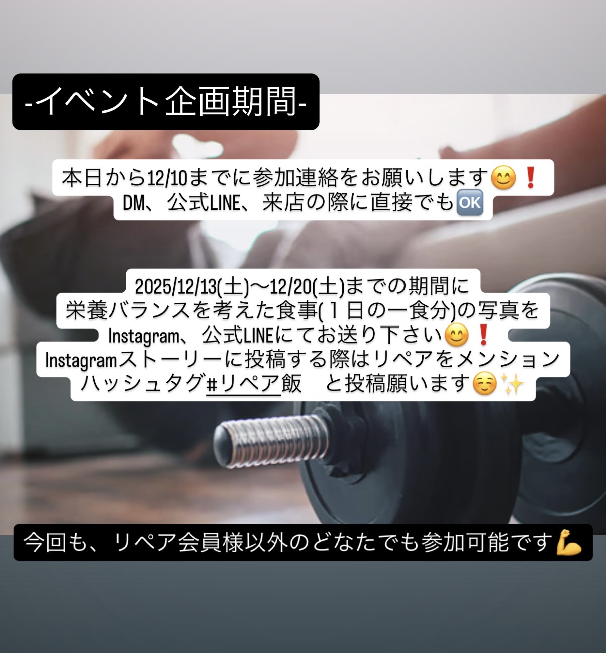 上記の通り開催致します^^!参加希望者は本日から12月10までにInstagram DM、または公式LINE、来店時に参加希望をお伝え下さい^^!ダイエット飯投稿期間は12月13日〜12月20日まで!期間は短く分かりやすく1週間!とさせて頂きます(こういう企画は短い方が実施しやすいですよね♪)そして、今回も・・・・